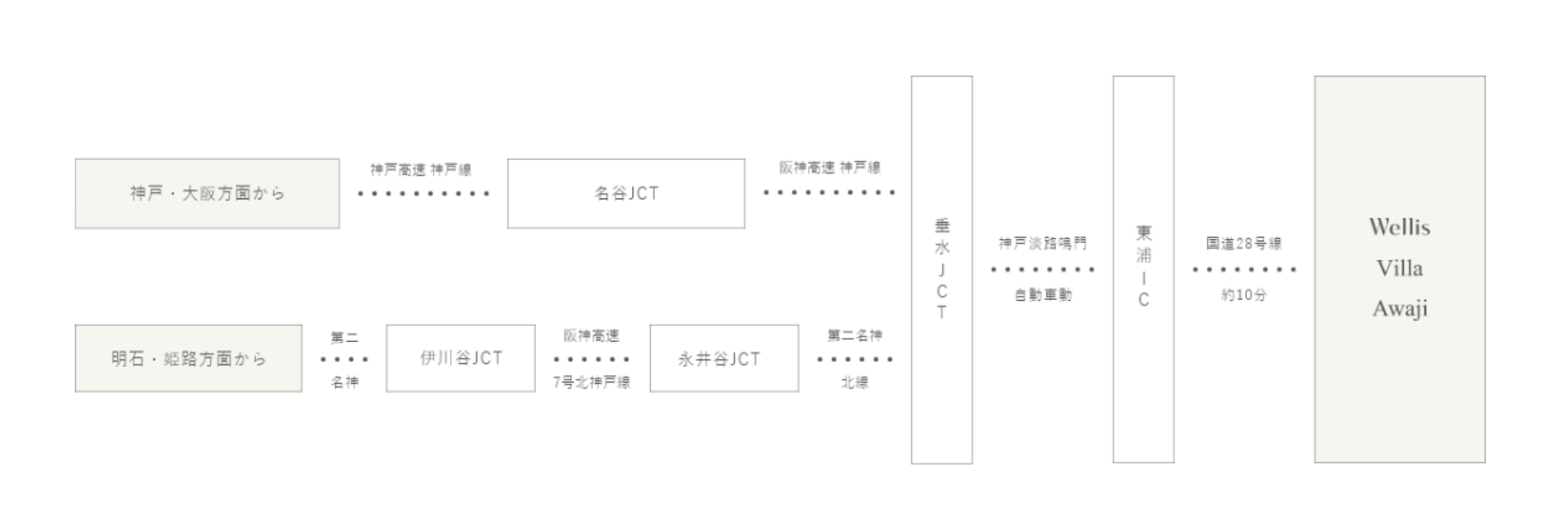 神戸・大阪方面からは、明石海峡大橋を渡り淡路島へお越しください。淡路ICを降りた後は、県道・国道を経由して約10分ほどで到着します。