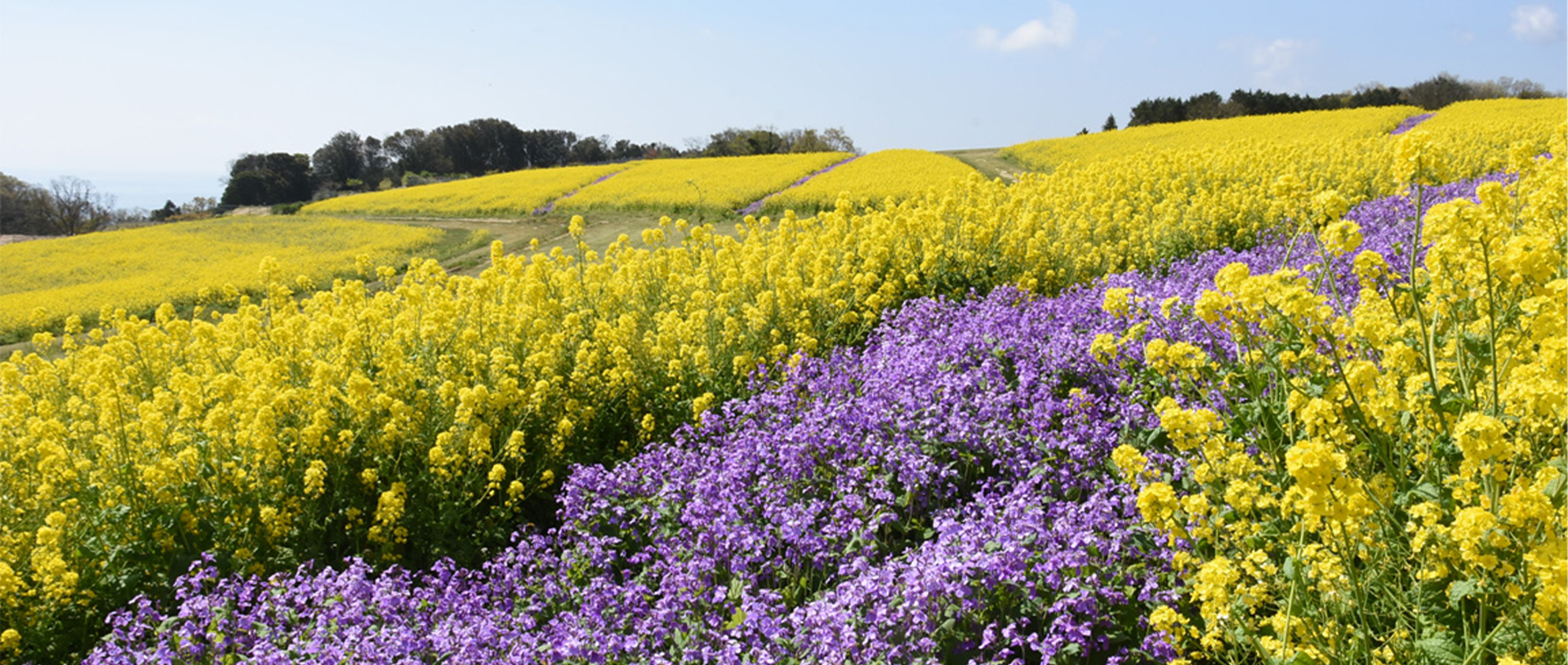なだらかな丘陵地に咲く花畑の向こうには海が見渡せ、開放感のある景色を楽しめます。