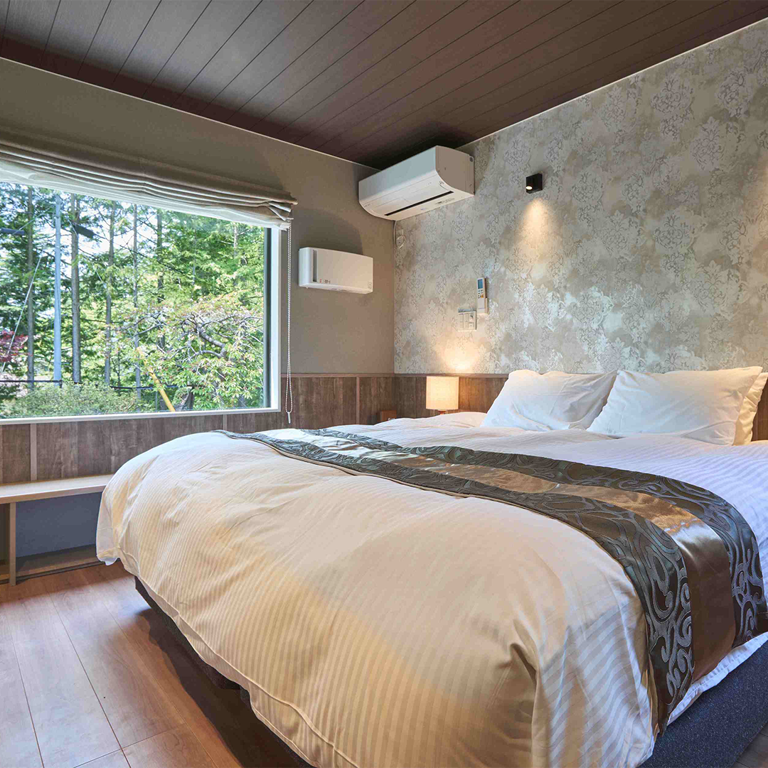 客室:宿泊フロアです。 大きな窓から光が差し込む開放的な空間に、ゆったりとくつろげるベッドルームを配置。 最大14名様まで宿泊可能なため、ご家族やご友人とのグループ旅行でも快適にお過ごしいただけます。 オーシャンビューを望むプライベートヴィラで、落ち着いた時間をお楽しみください。